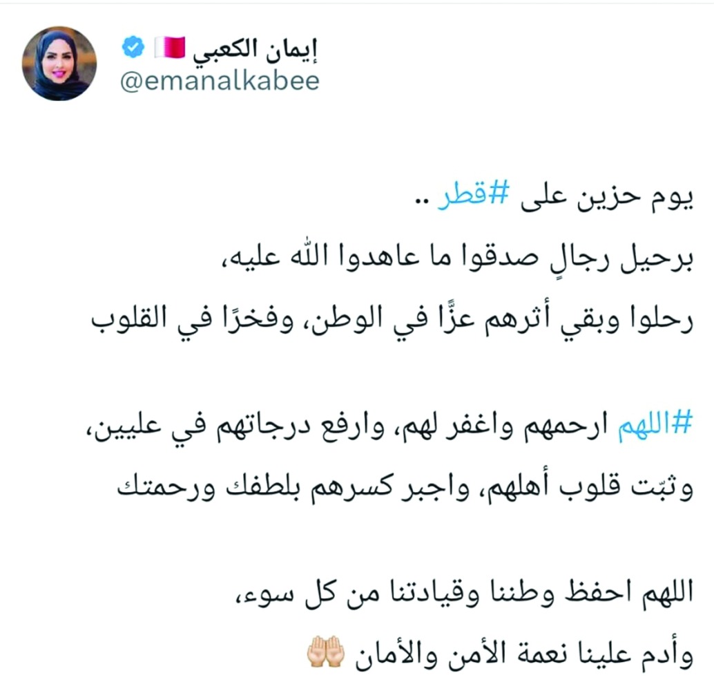 من جانبها، وصفت الإعلامية إيمان الكعبي امس بأنه يوم حزين على قطر، وقالت: برحيل رجال صدقوا ما عاهدوا الله عليه، رحلوا وبقي أثرهم عزًا في الوطن، وفخرًا في القلوب. ودعت المولى عز وجل لهم بالمغفرة والدرجة الرفيعة. ولأهلهم تثبيت القلوب وجبرها. كما دعت المولى ان يحفظ وطننا وقيادتنا من كل سوء، وأن يديم علينا نعمة الأمن والأمان.
