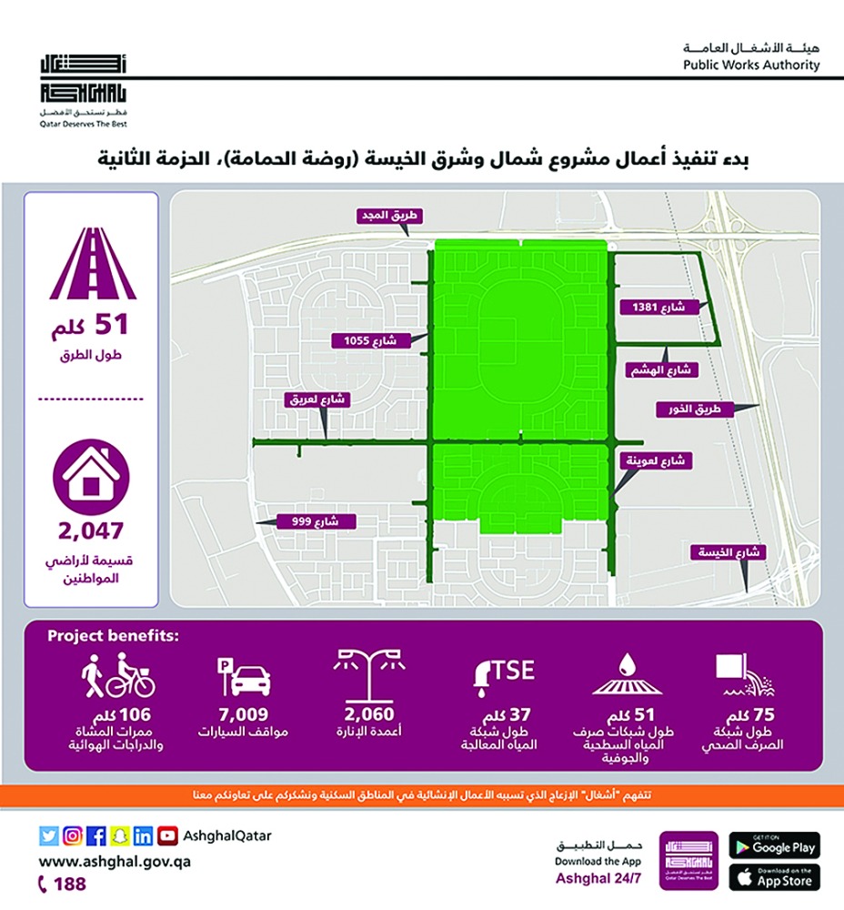 هذا وكانت هيئة الأشغال العامة «أشغال» قد أعلنت في وقت سابق عن تنفيذ خدمات البنية التحتية 7,833 قسيمة لأراضي المواطنين في مناطق مختلفة شمال وغرب وجنوب دولة قطر، حيث تم توفير شبكات طرق متطورة وبنية تحتية متكاملة لهذه القسائم من خلال عدد من مشاريع برنامج تطوير البنية التحتية للمناطق الذي تنفذه الهيئة؛ بهدف خدمة احتياجات السكان والمساهمة في تحسين جودة الحياة والظروف الصحية والبيئية في مختلف مناطق الدولة، وتماشيا مع أهداف رؤية قطر الوطنية 2030.