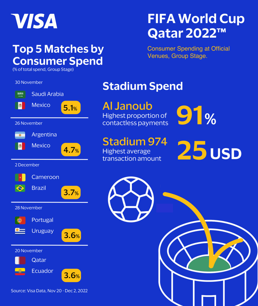 ووفقاً لبيانات الشركة، يوشك الإنفاق الاستهلاكي (من حيث القيمة) في كأس العالم FIFA قطر 2022 ™ أن يتجاوز إجمالي الإنفاق في بطولة كأس العالم 2018 بأكملها (89٪)، وتجاوز حالياً إجمالي الإنفاق المسجل في بطولة كأس العالم 2014 (192%). كما كشفت البيانات أن 88٪ من المدفوعات التي تمّت عبر Visa في المواقع الرسمية الخاصة بكأس العالم FIFA قطر كانت غير تلامسية.