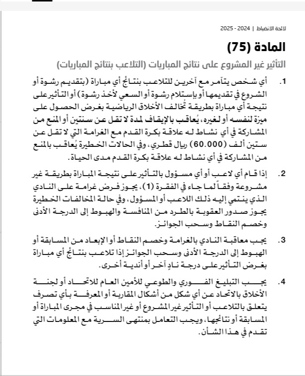 وتنص الفقرة الأولى وحسب نص المادة والتي تؤكد أن أي شخص يتآمر مع آخرين للتلاعب بنتائج أي مباراة (بتقديم رشوة أو الشروع في تقديمها أو باستلام رشوة أو السعي لأخذ رشوة)، يعاقب بالإيقاف لمدة لا تقل عن سنتين أو المنع من المشاركة في أي نشاط له علاقة بكرة القدم مع الغرامة 60 ألف ريال، وفي الحالات الخطيرة يعاقب بالمنع من المشاركة في أي نشاط مدى الحياة.