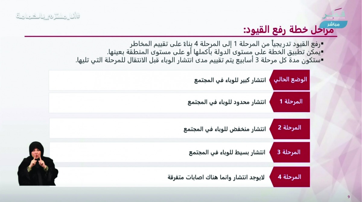 وأكد أن مدة كل مرحلة 3 أسابيع تقريباً، وأنه تقرر البدء في المرحلة الأولى من الرفع التدريجي للقيود بتاريخ 28 مايو الحالي، وقال: «يمكن تقديم موعد البدء بهذه المرحلة إلى 23 مايو إذا تم الالتزام بالاشتراطات».