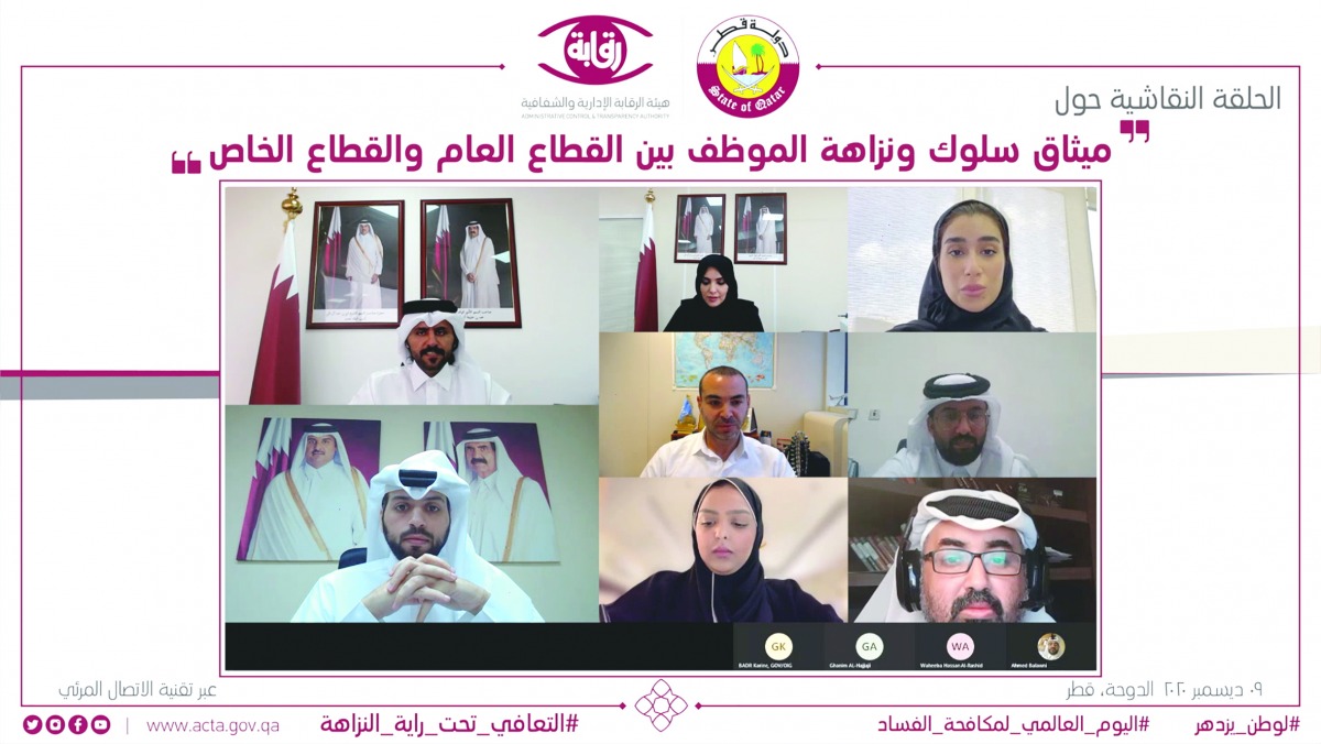 كما شاركت دولة قطر في المؤتمر الدولي الثاني 2020 «سياسات النزاهة والشفافية والمساءلة بين النظرية والتطبيق» الذي تنظمه هيئة مكافحة الفساد في دولة فلسطين، عبر تقنية الاتصال المرئي، حيث تم خلال المؤتمر عرض جهود دولة قطر في تعزيز النزاهة والشفافية ومكافحة الفساد في القطاع العام.