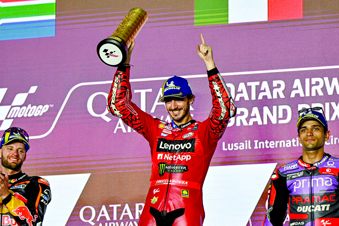 حقق الدراج الإيطالي فرانشيسكو باجنايا لقب فئة /الموتو جي بي/ ضمن منافسات جائزة الخطوط الجوية القطرية الكبرى، التي تشكل الجولة الافتتاحية من النسخة الخامسة والسبعين من بطولة العالم للدراجات النارية للموتوجي بي للموسم 2024، والتي استضافتها حلبة لوسيل الدولية على مدار ثلاثة أيام تحت الأضواء الكاشفة.