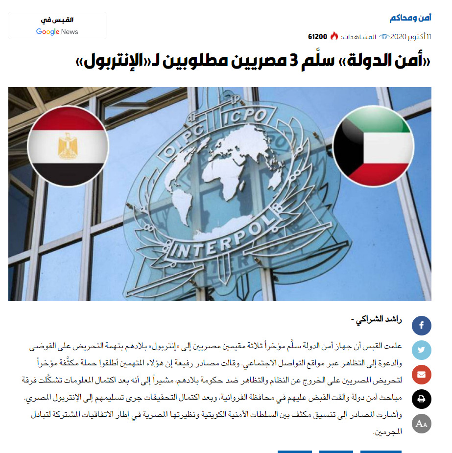 نشرت صحيفة القبس الكويتية خبرًا مفاده أن جهاز أمن الدولة الكويتي سلَّم مؤخراً ثلاثة مقيمين مصريين إلى «إنتربول» بلادهم بتهمة التحريض على الفوضى والدعوة إلى التظاهر عبر مواقع التواصل الاجتماعي.