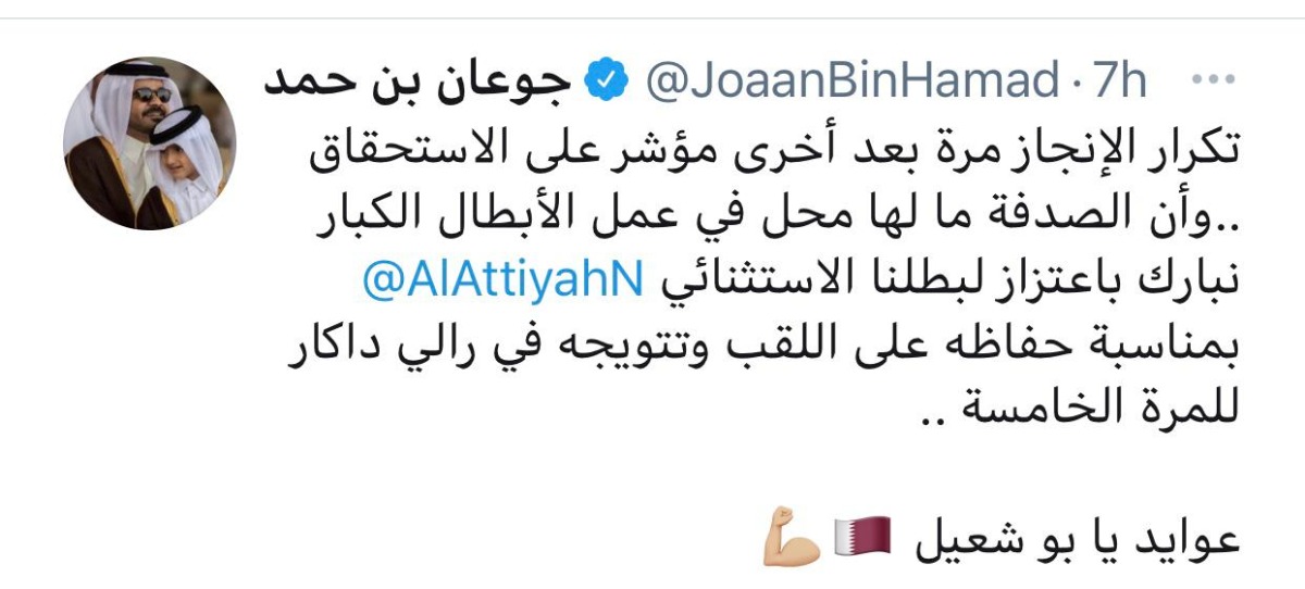 وغرد سعادته على صفحته الرسمية على موقع «تويتر»: «تكرار الإنجاز مرة بعد أخرى مؤشر على الاستحقاق وأن الصدفة ما لها محل في عمل الأبطال الكبار..نبارك باعتزاز لبطلنا الاستثنائي @AlAttiyahN بمناسبة حفاظه على اللقب وتتويجه في رالي داكار للمرة الخامسة..عوايد يا بو شعيل».