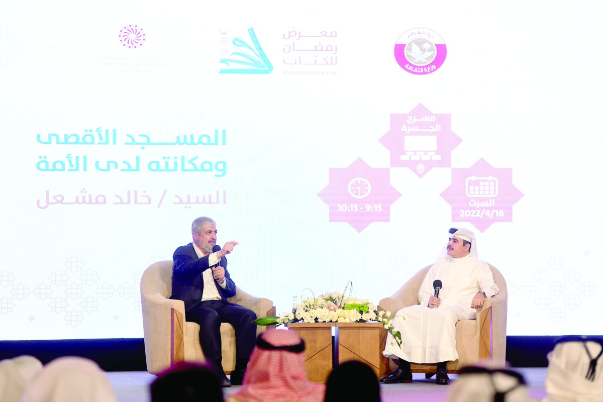 أقيمت مساء أمس آخر ندوة ضمن فعاليات معرض رمضان للكتاب، بعنوان المسجد الأقصى ومكانته لدى الأمة.  حضر الندوة سعادة الشيخ عبدالرحمن بن حمد آل ثاني وزير الثقافة وعدد من أصحاب السعادة السفراء المعتمدين لدى الدولة وجمع من المثقفين وجمهور المعرض.  وتحدث خلال الندوة السيد خالد مشعل الرئيس السابق للمكتب السياسي لحركة للمقاومة الاسلامية في فلسطين «حماس»، وقدمها الاعلامي الدكتور عبدالله فرج.
