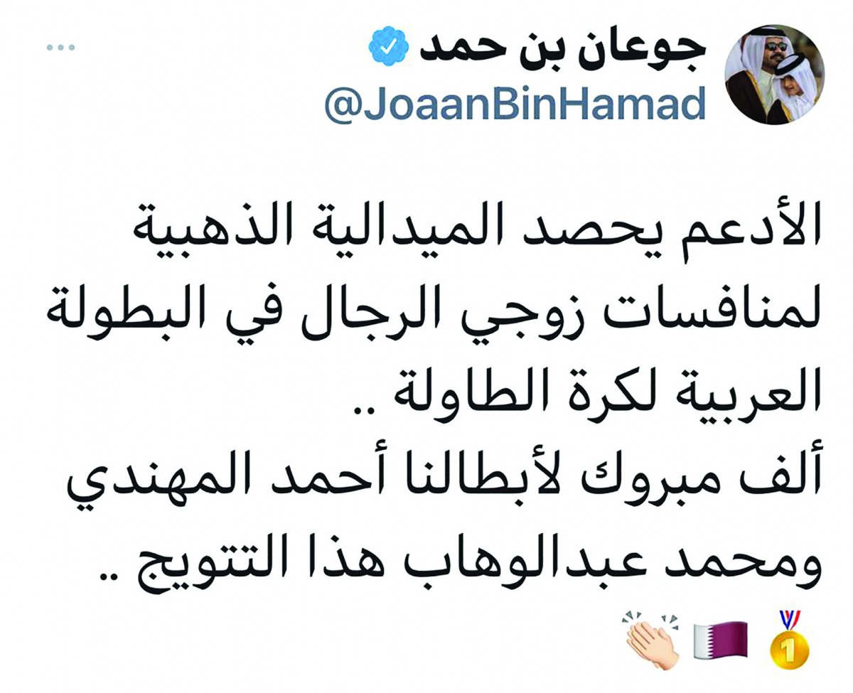 وغرد سعادة الشيخ جوعان بن حمد رئيس اللجنة الأولمبية عبر حسابه في تويتر مقدما التهنئة لأبطال الأدعم، خاصة الثنائي أحمد خليل المهندي ومحمد عبدالوهاب بعد فوزهما الرائع بالميدالية الذهبية في منافسات زوجي الرجال.