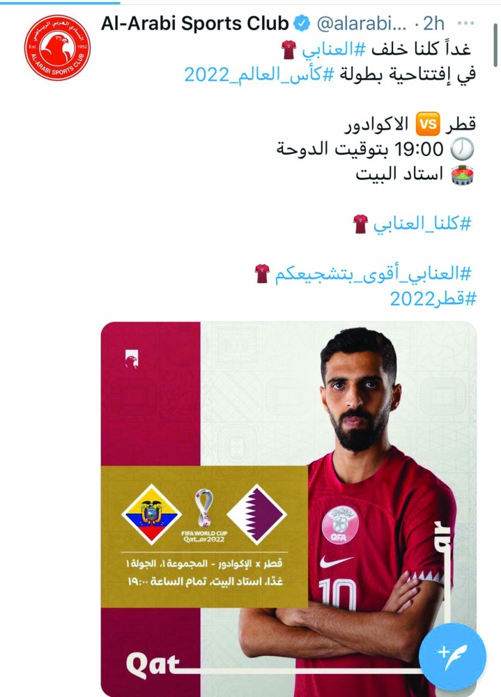 مع تأهب العنابي لخوض مباراته الأولى أمام الإكوادور في الجولة الأولى اليوم بكأس العالم قطر 2022 على ملعب البيت المونديالي، تتفاعل المواقع الرسمية للأندية لدعم العنابي من خلال نشر الصور ومقاطع الفيديو والأغاني الوطنية، وكل شيء يخص منتخبنا، وذلك على مواقع التواصل الاجتماعي المختلفة في تفاعل مميز يعطي رونقاً رائعاً على المنصات الرسمية في رسائل تؤكد أن الجميع مع العنابي قلباً وقالباً في مشاركته المونديالية الأولى التي تمثل أهمية كبرى لاسيما أنه يشارك بها وهو صاحب الأرض والجمهور وبطل آسيا، كما قام نادي الدحيل بتوزيع أعلام وأوشحة لدعم ومؤازرة المنتخب الوطني في افتتاح البطولة أمام الإكوادور الليلة في مواقف استاد البيت في لافتة مميزة من إدارة النادي وسوف يستمر التفاعل من قبل الأندية دعماً لمنتخبنا في بقية المشوار، ومما لا شك فيه أن المؤازرة التي يحظى بها العنابي أمر مهم لدى الجهاز الفني واللاعبين لتحقيق النتائج المرجوة في البطولة المونديالية التي تُقام للمرة الأولى في المنطقة العربية والشرق الأوسط.