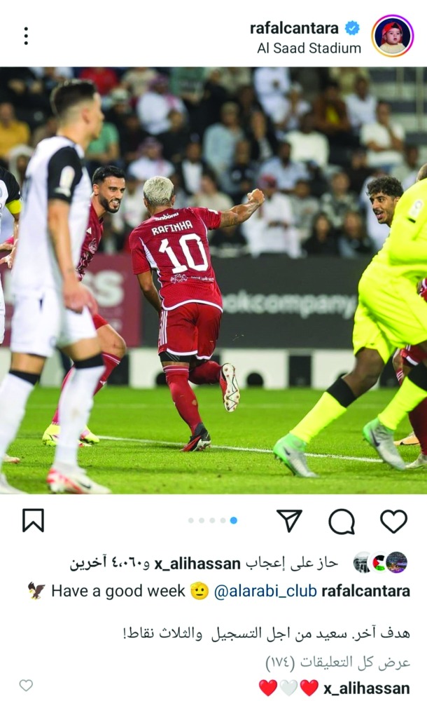حيث حرص نجوم العربي على الاحتفال مع الأنصار بالانتصار الثمين الذي حققه الفريق على السد، البداية كانت بنجم المنتخب السنغالي ونادي العربي اللاعب عبدو ديالو احتفل بطريقته الخاصة عقب الانتصار على المتصدر وعودة العربي للواجهة من جديد وكتب اللاعب عبر صفحته على الإنستغرام «نحن أقوياء معًا العمل الجماعي أتى بثماره الليلة شكرا على الدعم يا له من فوز! وتتويج جهودنا بنقاط اللقاء»، انهالت تعليقات عشاق العربي على احتفالية أسد الترانغا وأكد جمهور النادي أنهم على ثقة كبيرة في استعادة الفريق موقعه الطبيعي بنهاية الموسم، وأكدوا دعمهم اللامحدود لكل المنظومة حتى يتحقق الهدف المنشود. القناص السوري عمر السومة بدوره شارك الجماهير الانتصار التاريخي على المتصدر وكتب عبر صفحته «الحمد لله.. فوز مهم للعرباوية وإن شاء الله تكون بداية لكل خير». عشاق العرباوية أكدوا فرحتهم الكبيرة وتفاعلوا مع صديق الشباك على الرغم من غيابه عن التهديف في الجولة الماضية وأكدوا أنهم ينتظرون منه الكثير في قادم التحديات، تواصلت احتفالات نجوم النادي العربي باللحظات الاستثنائية. النجم العالمي الإيطالي ماركو فيراتي عبر عن سعادته الغامرة بالانتصار على الزعيم مستعيناً بالصورة الجماعية رفقة الزملاء واضعا عليها علامة «صاح» باللون الأخضر قاصدا اجتيازهم محطة الزعيم بنجاح أداءً ونتيجة، ختام الاحتفالات كان من عريس الأمسية النجم الإسباني رافينيا الكنتارا الذي حسم الديربي مانحا النقاط الثلاث لفريقه وكتب اللاعب عبر صفحته على الإنستغرام «أسبوع سعيد، هدف آخر سعيد من أجل التسجيل وخطف ثلاث نقاط»، الجماهير أطلقت عليه لقب الحاسم عقب تسجيله للهدف وإدخال الفرحة لكل العرباوية وأكدت أنها سعيدة بتواجد نجم بقامة الكنتارا في صفوف العربي العريق، مشيرةً أن حسم الديربي هو مفتاح العبور نحو العودة للمسار السليم وختام الموسم بالطريقة التي يتمناها الجميع.