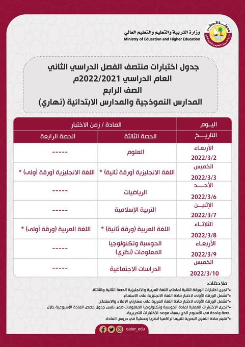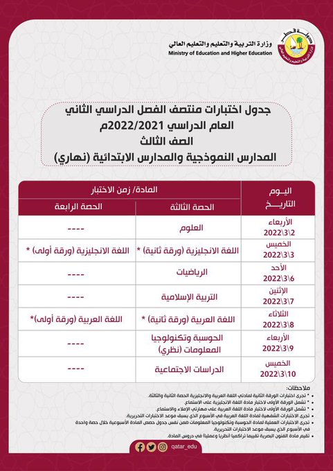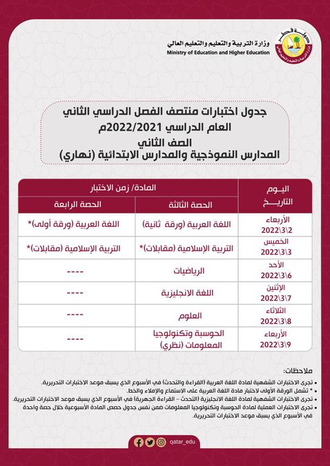 أعلنت وزارة التربية والتعليم والتعليم العالي عن جداول اختبارات منتصف الفصل الدراسي الثاني ودعت عبر حسابها الرسمي على تويتر أولياء الأمور والطلبة إلى الدخول على الرابط التالي للتعرف على كافة التفاصيل: