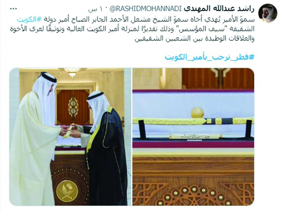 بينما أشاد راشد عبدالله المهندي بحسن الاستقبال قائلا «سمو الأمير يهدي أخاه سمو الشيخ مشعل الأحمد الجابر الصباح أمير دولة الكويت الشقيقة سيف المؤسس تقديرًا لمنزلة أمير الكويت العالية وتوثيقًا لعرى الأخوة والعلاقات الوطيدة بين الشعبين الشقيقين».