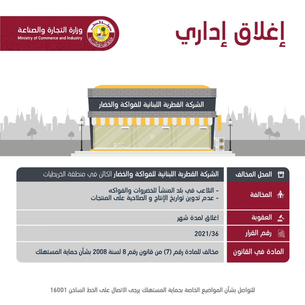 أعلنت وزارة التجارة والصناعة عن إغلاق عدد من فروع إحدى الشركات التجارية الكبرى، وذلك لقيامهم بالتلاعب في بلد المنشأ للخضراوات والفواكه، وبيع منتجات تالفة والتلاعب في تواريخ الصلاحية والأوزان وعدم تدوين تواريخ الإنتاج والصلاحية على المنتجات وبيع لحوم منتهية الصلاحية.