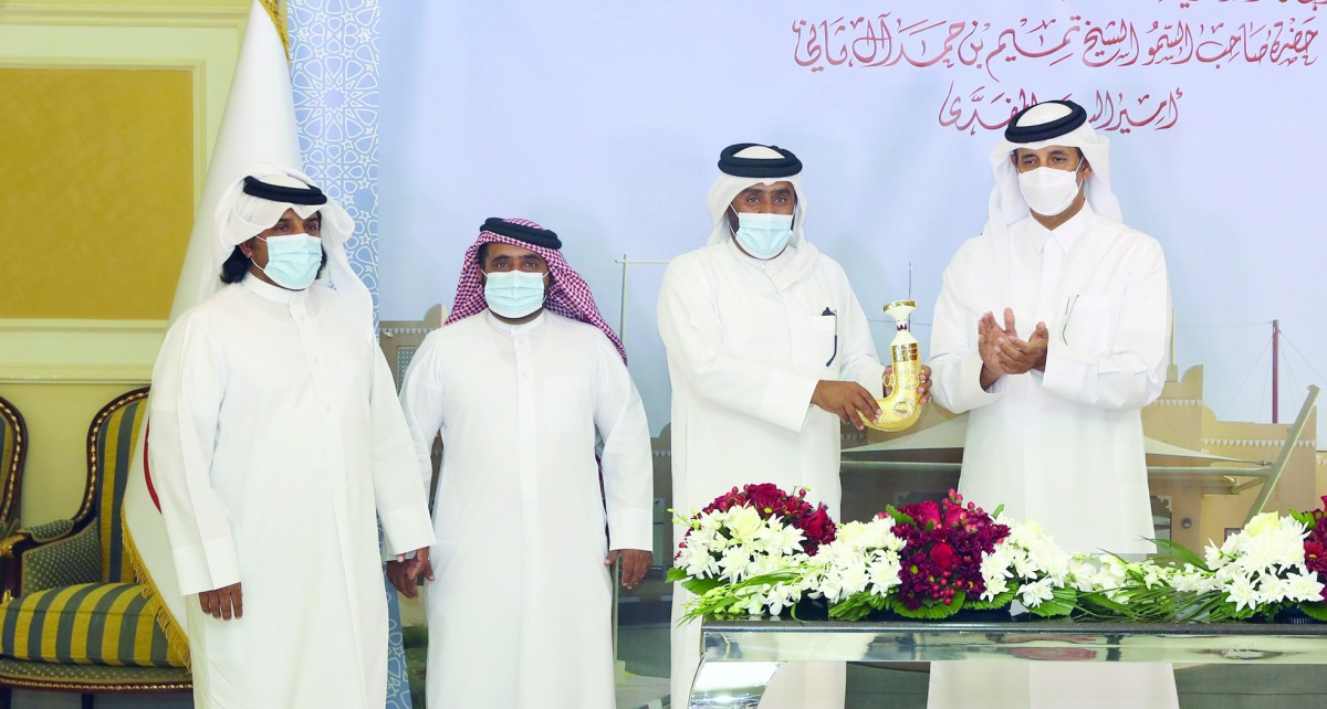 وفي الشوط الثالث بالمسائية، والثاني للبكار، المخصص للعمانيات أهدت «ود» الناموس إلى هجن العاصفة، وتحقيق الشلفة الذهبية والجائزة المالية وقدرها 400 ألف ريال، بعد تحقيق المركز الأول بزمن قدره 7.24.80 د، وذلك بقيادة المضمر غياث الهلالي. وبعد ختام أشواط الفترة المسائية، أمس، قام عبدالله بن محمد الكواري نائب رئيس اللجنة المنظمة لسباق الهجن بتتويج الفائزين بالناموس والرموز الأربعة، حيث بدأ بتتويج فوز هجن الرئاسة بالشلفة الذهبية للقايا البكار مفتوح، وتسلّم الشلفة المضمر أحمد مطر الخيلي، ثم تسلّم المضمر المشاغب محمد بن خالد العطية الخنجر الذهبي للقايا القعدان مفتوح بفوز «مشيرب»، ملك هجن الشيحانية، ثم تسلّم على الترتيب غياث الهلالي الشلفة الذهبية بفوز «ود»، ملك هجن العاصفة بالشوط الرئيسي للقايا البكار عمانيات.. ثم تسلّم جابر سالم بن فاران الخنجر الذهبي بفوز «زاهي» ملك هجن الرئاسة بالخنجر الذهبي للقايا القعدان عمانيات.