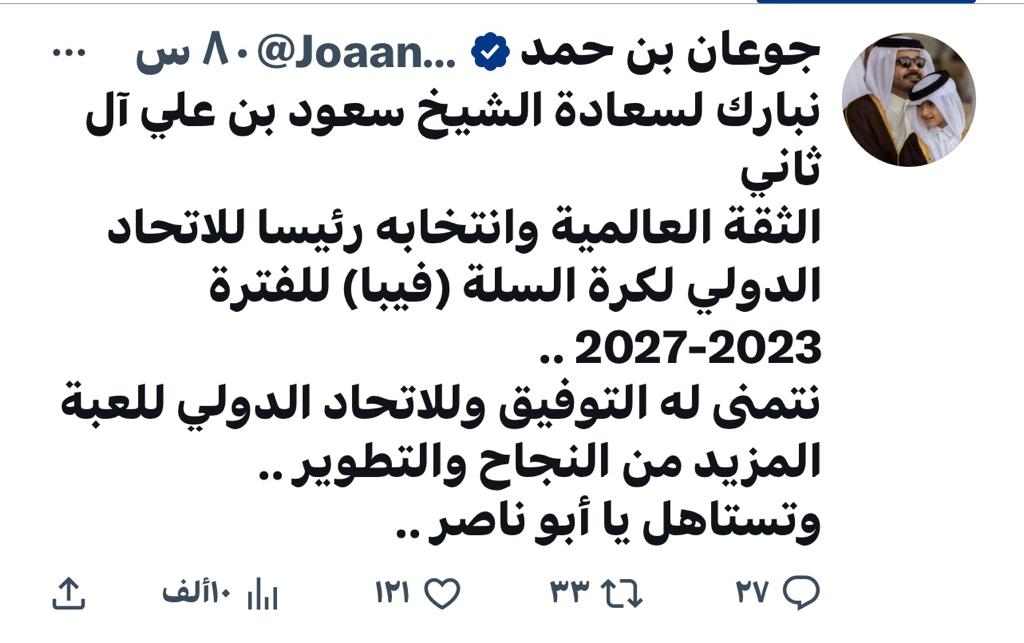 وقال سعادته عبر حسابه الرسمي على «إكس»: نبارك لسعادة الشيخ سعود بن علي آل ثاني الثقة العالمية وانتخابه رئيسا للاتحاد الدولي لكرة السلة (فيبا) للفترة 2023- 2027.. نتمنى له التوفيق وللاتحاد الدولي للعبة المزيد من النجاح والتطوير.. وتستاهل يا أبو ناصر.
