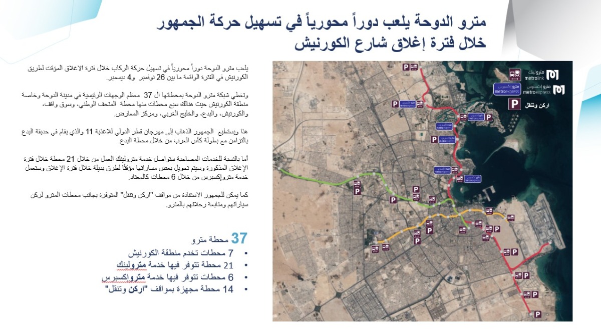 وعن طرق الوصول للكورنيش قال:"الكورنيش شريان رئيسي لكن يوجد شريان آخر تحت الأرض وهو "المترو" الذي يضم 37 محطة في جميع أنحاء الدولة، و14 محطة منها فيها خدمة "أركن وتنقل" من خلال صف السيارة بجوار المحطة وركوب المترو بكل أريحية، للوصول إلى محطات المترو المختلفة على الكورنيش، وبالتالي المترو هو الحل الأمثل خلال فترة الإغلاق.