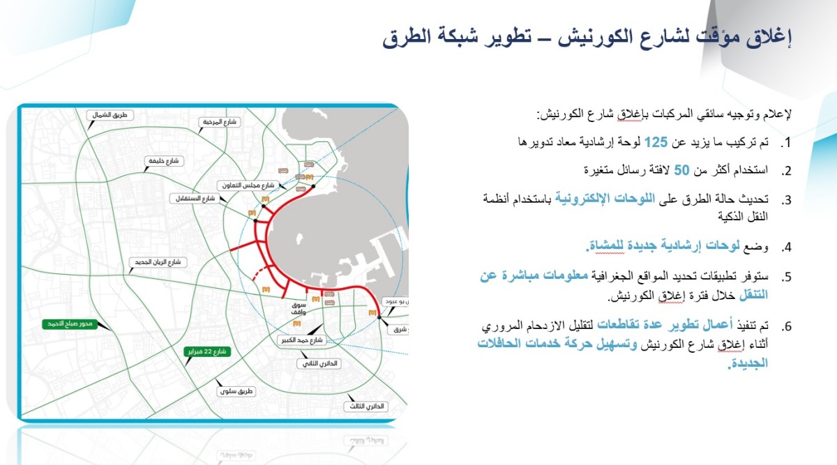 وعن توقع الازدحام في الطرق خلال فترة الإغلاق قال: لدينا خططنا والتدابير اللازمة لتقليل الازدحام من خلال استخدام خدمة ركن وتنقل و ايضا ربط الإشارات ببعضها من أجل تسهيل الحركة وأيضا رجال الأمن موجودين على جميع التقاطعات لعدم تعطل الاشارات، بالإضافة إلى تواجد طرق وخطوط بديلة لجميع الجهات حيث لدينا أكثر 52 جهة كان دخولها من الكورنيش الآن سيكون دخولها من الشوارع الخلفية للكورنيش، وسيكون لها مداخل ومخارج، وقد قمنا بجميع التدابير اللازمة تم القيام بها.