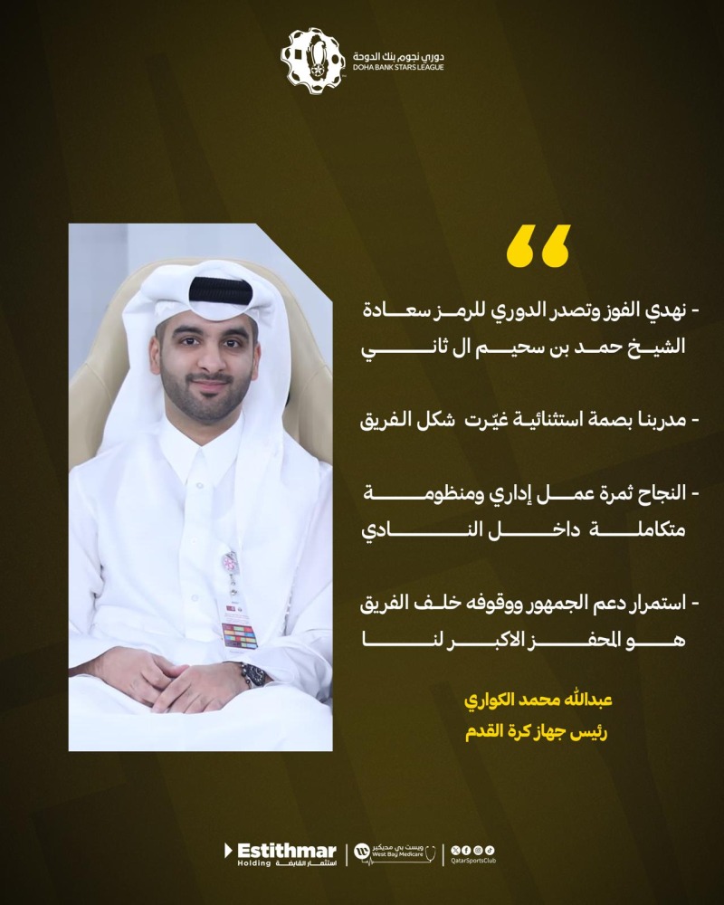 قال عبد الله الكواري رئيس جهاز الكرة بنادي قطر إن الفوز الذي تحقق جاء نتيجة الروح والأداء القوي للاعبين، ونهدي هذا الفوز وتصدر الدوري لسعادة الرمز الشيخ حمد بن سحيم آل ثاني، فهو الداعم الأول لمسيرة النادي.