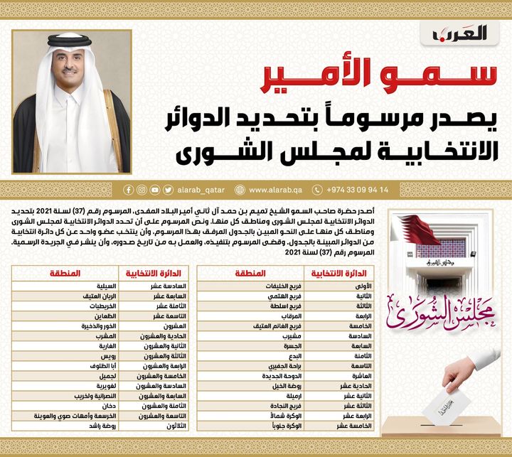 أصدر حضرة صاحب السمو الشيخ تميم بن حمد آل ثاني أمير البلاد المفدى، القانون رقم (6) لسنة 2021 بإصدار قانون نظام انتخاب مجلس الشورى.