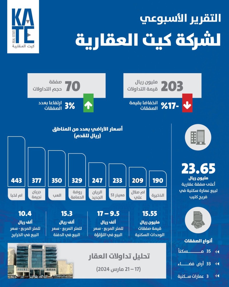 وجرى تنفيذ الصفقات مناطق اللؤلؤة والدفنة والخرايج، حيث شهدت منطقة اللؤلؤة تنفيذ 5 صفقات بقيمة 11.1 مليون ريال وتراوح سعر البيع في اللؤلؤة ما بين 9.5 إلى 17 ألف ريال للمتر المربع، وتم تنفيذ 3 صفقات في منطقة الدفنة بقيمة 7.4 مليون ريال، وبلغ سعر البيع في الدفنة 15.3 ألف ريال للمتر المربع، كما شهدت منطقة الخرايج صفقة واحدة بقيمة 1.1 مليون ريال وبلغ سعر البيع بها 10.36 ألف ريال للمتر المربع.